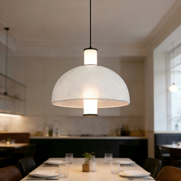 2025 మిలన్ యూరోల్యూస్ ఎగ్జిబిషన్లో అత్యాధునిక డిజైన్ ట్రెండ్ల నుండి ప్రేరణ పొందిన ఈ మినిమలిస్ట్ ఇటాలియన్ సిల్క్ మెష్ లాకెట్టు ల్యాంప్ స్ట్రాంగ్ లైటింగ్ నుండి ఇటాలియన్ మినిమలిజమ్ను ఆచరణాత్మక కార్యాచరణతో సజావుగా మిళితం చేస్తుంది. సెంట్రల్ 15W LED లైట్ సోర్స్ 4000K న్యూట్రల్ లైట్ను విడుదల చేస్తుంది, ఇది సౌకర్యవంతమైన వాతావరణాన్ని సృష్టిస్తుంది. 1500LM ప్రకాశం మరియు Ra>80 యొక్క అధిక రంగు రెండరింగ్ సూచికతో, కాంతి సహజంగా మరియు నిజమైన జీవితాన్ని కలిగి ఉంటుంది, ఇది లివింగ్ రూమ్లు, డైనింగ్ రూమ్లు మరియు ఇతర ప్రదేశాలకు అనుకూలంగా ఉంటుంది. రౌండ్ ఆర్చ్-ఆకారపు లాంప్షేడ్ తెల్లటి సిల్క్ ఫాబ్రిక్ చుట్టూ చుట్టబడిన ఇనుప మెష్తో తయారు చేయబడింది మరియు మాట్ బ్లాక్ హార్డ్వేర్ ఆకృతిని జోడించడానికి స్ప్రే పెయింట్ ప్రక్రియతో పూర్తి చేయబడింది. సరళమైన డిజైన్ నార్డిక్, ఆధునిక మరియు ఇతర గృహ శైలులతో సులభంగా కలిసిపోతుంది.