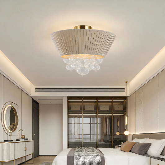 యూరోపియన్ మరియు అమెరికన్ మార్కెట్లలో దాని దీర్ఘకాలిక సేవ సమయంలో, స్ట్రాంగ్ లైటింగ్ ఎల్లప్పుడూ తుది వినియోగదారుల సౌందర్య అవసరాలు మరియు వినియోగ దృశ్యాలపై చాలా శ్రద్ధ చూపుతుంది. ఈ సీలింగ్ లాంప్ యొక్క ఫాబ్రిక్ లాంప్షేడ్ చేతితో నొక్కిన ఆకృతి పద్ధతులతో తయారు చేయబడింది, ఇది సహజమైన మరియు త్రిమితీయ మడత ఆకృతిని సృష్టిస్తుంది. ఇది ప్రసరించే కాంతి మృదువైన మరియు సమానంగా పంపిణీ చేయబడుతుంది, ఇది వెచ్చని మరియు సౌకర్యవంతమైన లైటింగ్ వాతావరణాన్ని సృష్టిస్తుంది. క్రింద వేలాడుతున్న గాజు బుడగలు చేతితో ఊడిపోయాయి, ప్రతి ఒక్కటి కొద్దిగా భిన్నమైన ఆకారాన్ని కలిగి ఉంటాయి. వెలిగించినప్పుడు, అవి సస్పెండ్ చేయబడిన లైట్ పూసల వలె కనిపిస్తాయి, డైనమిక్ మరియు మనోహరమైన కాంతి మరియు నీడ ప్రభావాన్ని ప్రదర్శిస్తాయి. ఇది నార్డిక్ మినిమలిస్ట్ రెసిడెన్షియల్ స్పేస్లో లేదా తేలికపాటి లగ్జరీ స్టైల్తో కూడిన వాణిజ్య ప్రదేశంలో ఉపయోగించబడినా, ఇది స్థలం యొక్క నాణ్యతను గణనీయంగా పెంచుతుంది.